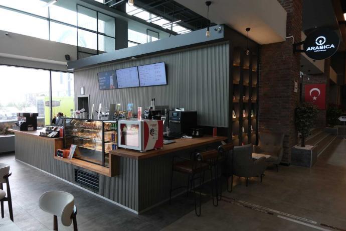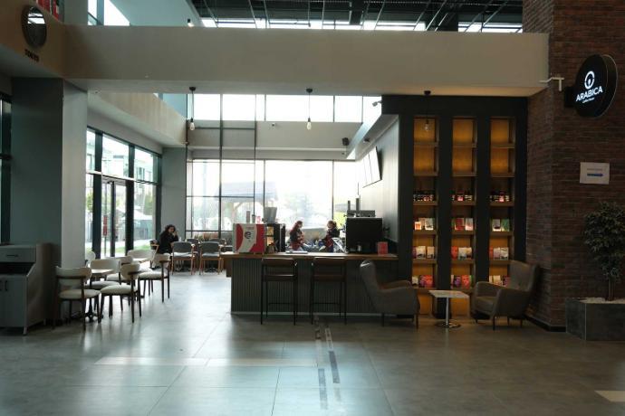- F Block Ground Floor – Arabica Coffee: Coffee, desserts, sandwiches, and a seating area.